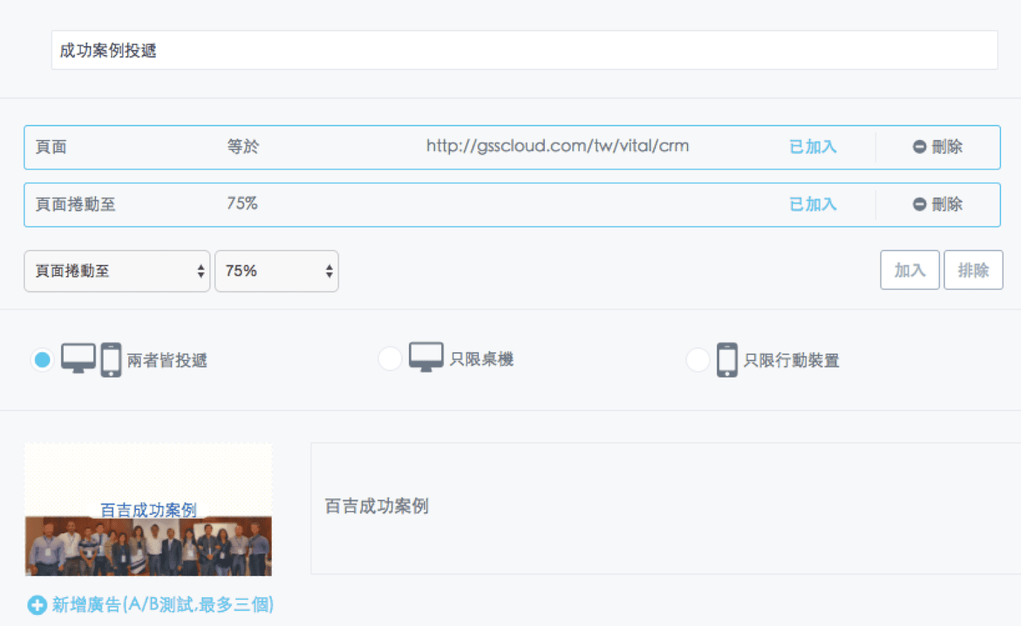 Kerebro 可以讓你根據不同的情境,設定廣告投遞的條件,例如:訪客到達頁面、流量來源、停留時間、瀏覽頁數、到訪次數及頁面下捲百分比...等,通過這些細緻的條件設定,確保每個廣告都能夠精準地觸達目標客戶,讓廣告能夠在最合適的時機,展示給最適合的訪客,有效刺激訪客成交!