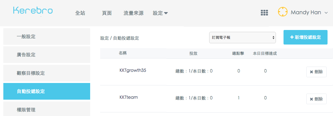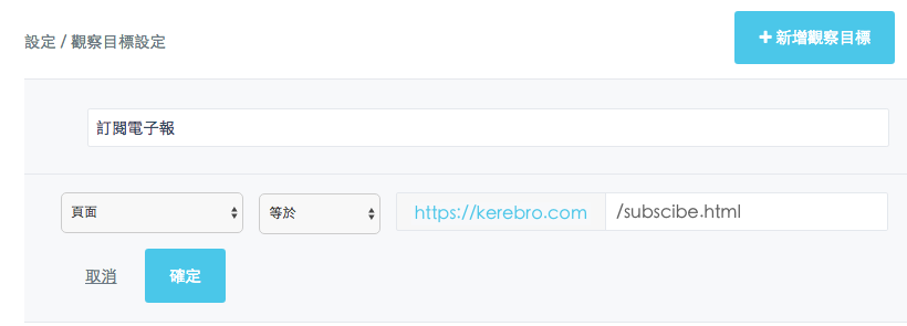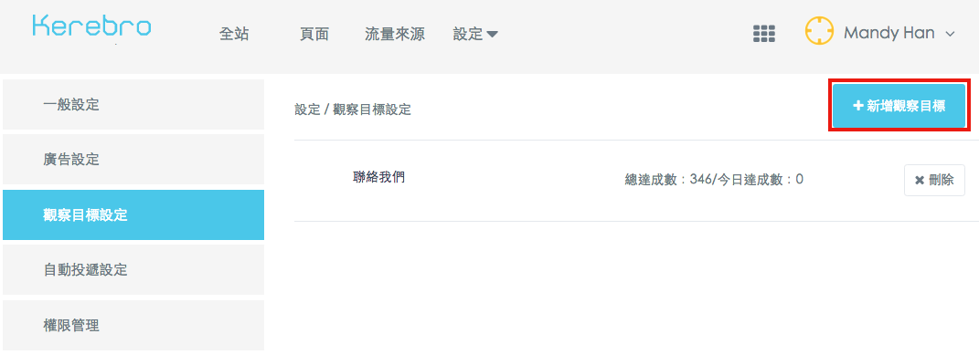 Kerebro為了讓您可以即時了解「站外廣告」及「站內廣告」究竟有沒有導引客戶完成轉換,我們可以設定觀察的目標。