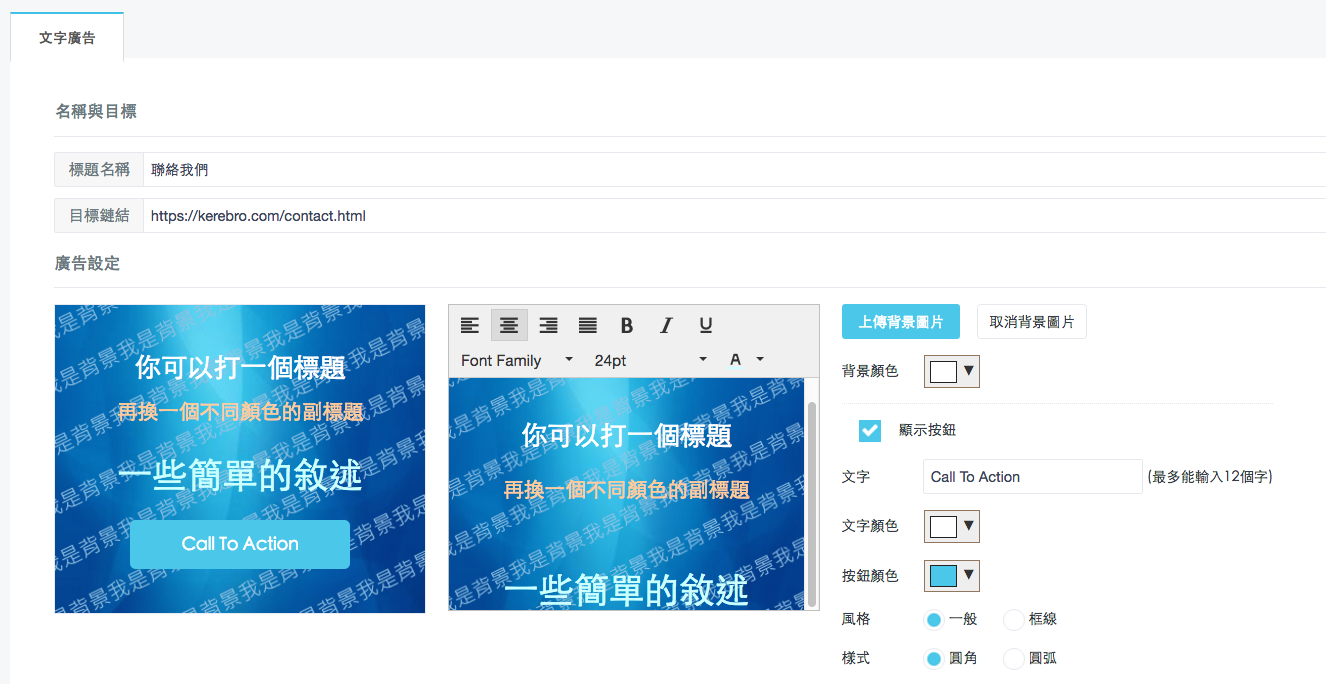 一樣填寫標題和點擊目標,並輸入文字