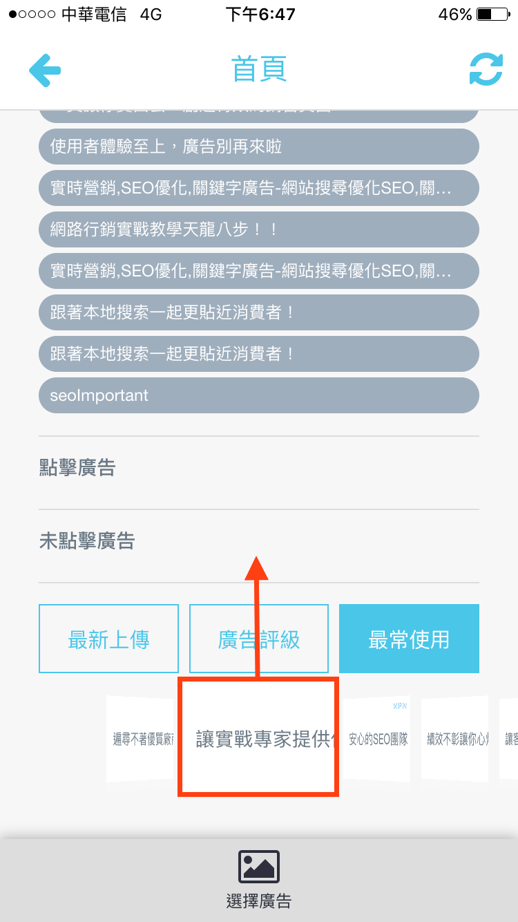 也可以針對訪客選擇適合的廣告投放,投放方式非常簡單,只要用手指壓著你希望投放的廣告,並往上滑後放開,廣告就會投放出去囉!