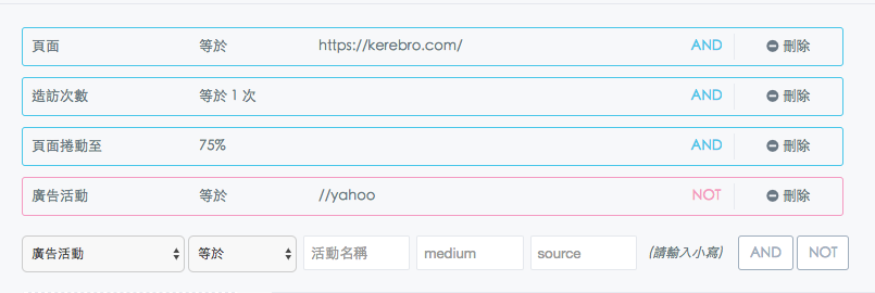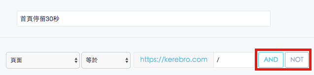 *其餘條件僅能各出現在AND和NOT中一次,例如你無法設定「頁面等於首頁」AND「頁面等於方案頁」