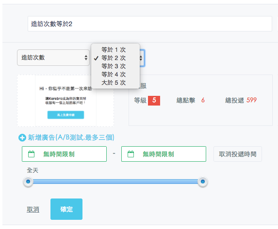 這個我們可以運用後台 「設定」-->「自動投遞」--> 「造訪次數」 的功能來鎖定,具體有什麼樣的運用情境呢?
